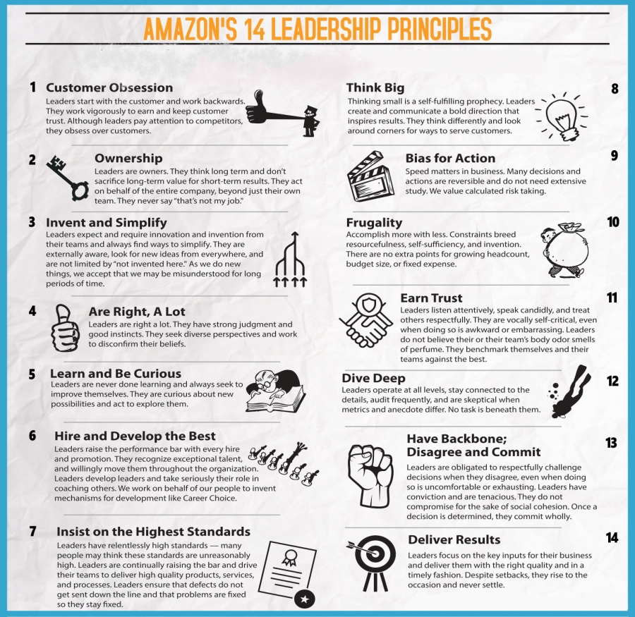 2) Jeff Bezos ayrılmadan hemen önce 2 adet prensip daha eklenmiş. Bana göre onun onayladığı prensipler değil. 'Gitmeden bunları da ekleyelim de, onun prensipleri gibi gözüksün' amacıyla yapılmış bir hamle gibi düşündüm.